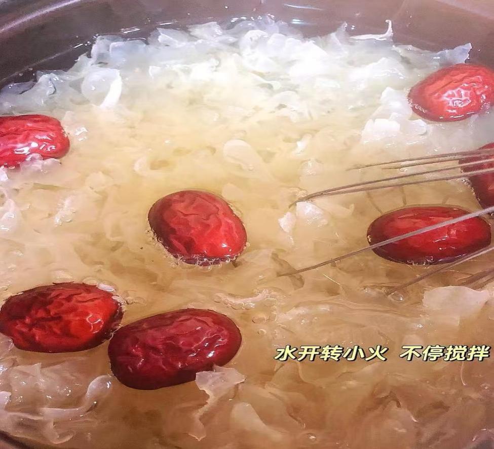 5. 看到出浓胶后再添加枸杞,每一步骤都不间断的搅拌搅拌。搅拌几分钟出锅!