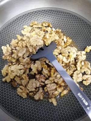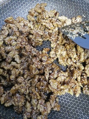 步骤8.炒至糖芝麻都完全裹核桃仁上,控制好锅温,炒至干锅。