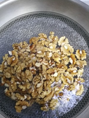 步骤3.水烧开,倒入生核桃仁,煮两分钟捞出备用,这部为了去苦涩味。