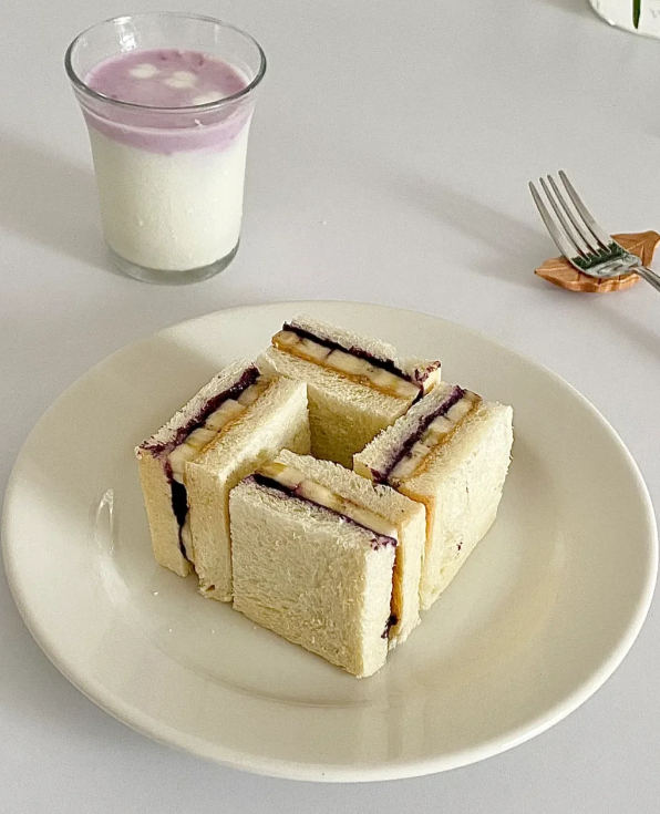 2.一片吐司抹花生酱加香蕉片,一片吐司抹蓝莓酱。