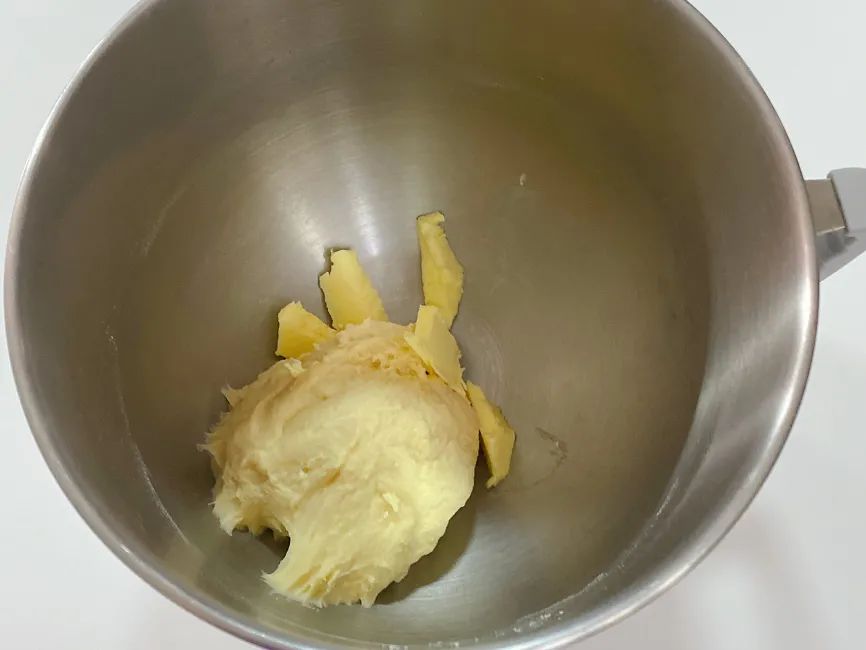2.放入软化黄油,厨师机开7档4分钟。