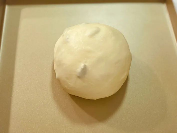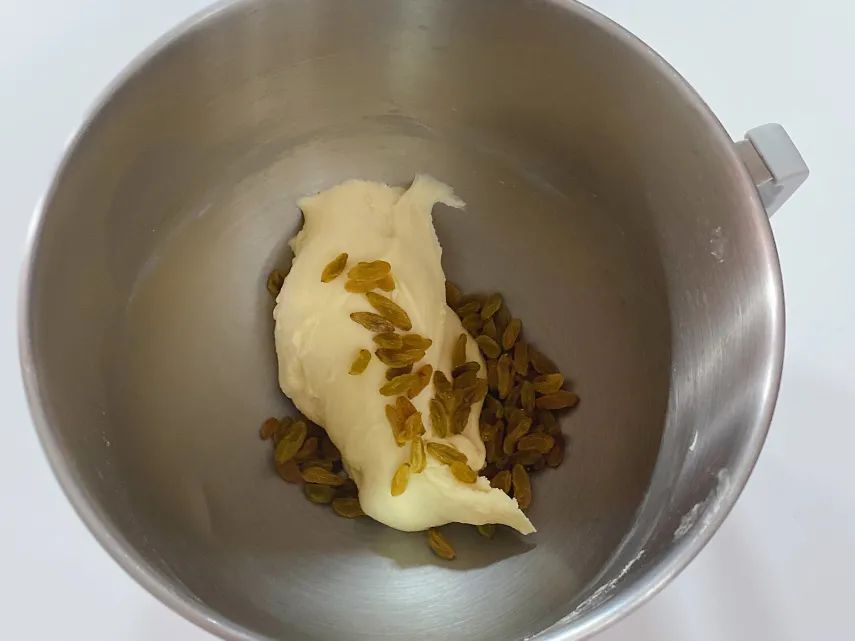3.放入葡萄干,厨师机开4档半分钟,把葡萄干拌入面团。