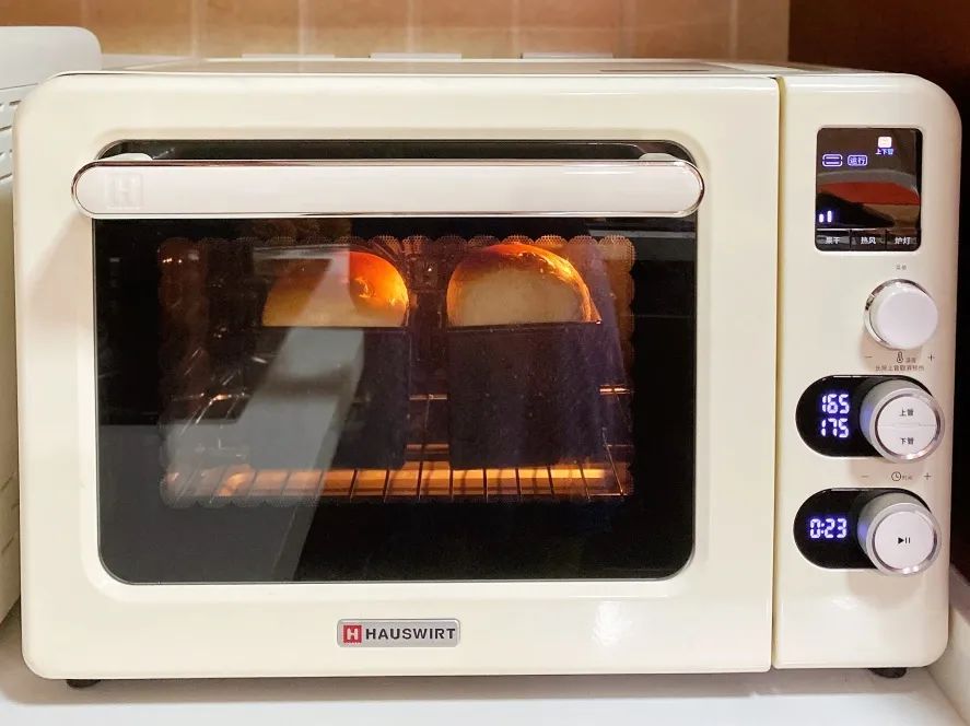 4.把面团放入烤箱,用发酵功能发酵1小时,温度35,再放一杯温水加湿。