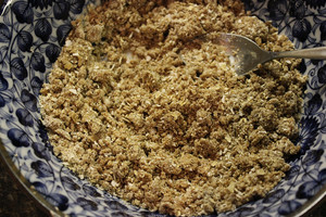 2.烤箱预热175摄氏度,模具垫烘焙纸备用。将黄油,路牌花生酱,中筋面粉,肉桂粉全部放到碗里,混合均匀,用手搓成颗粒状备用。