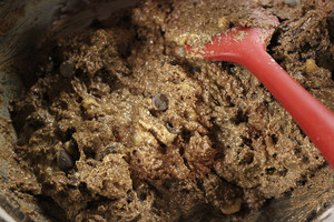 5.将步骤4和5混合,切割式拌匀到还能看见干粉即可,放入巧克力豆,不要过度搅拌,面糊状态为粘稠略微能流动。