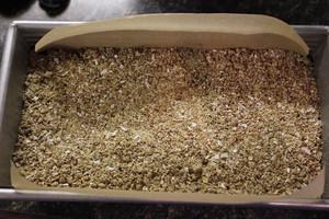 6.把面糊倒入模具,表面略抹平,表面均匀地撒上做好的花生酥粒,用手轻轻按实,让酥粒粘在面糊上。