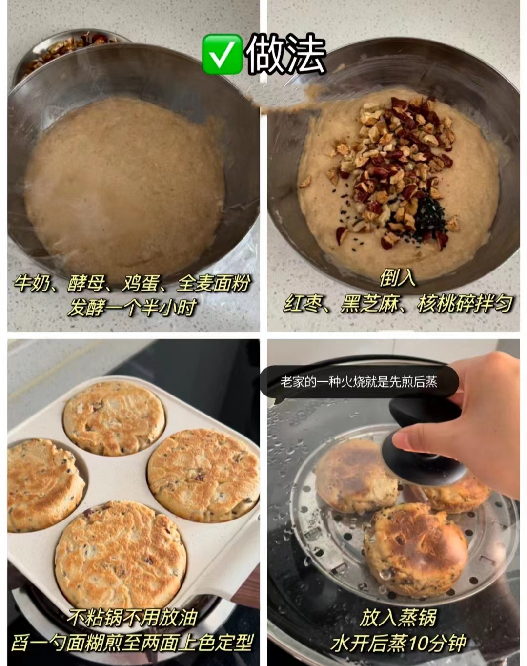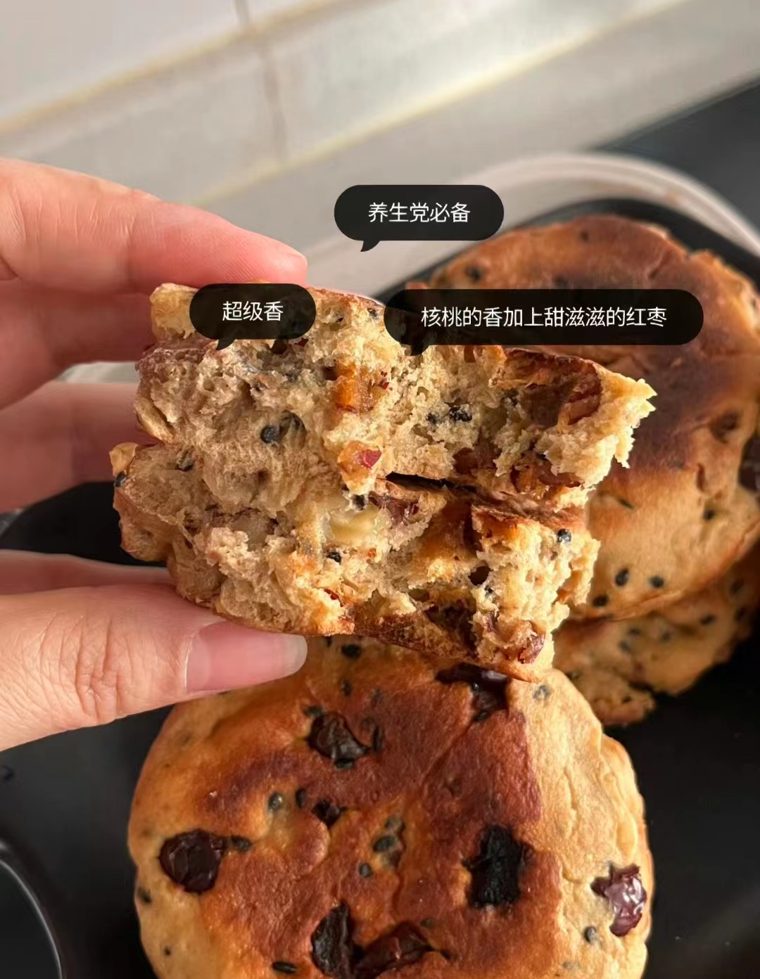 今天给大家推荐一款全麦饼,核桃的香配上红枣的甜,加上黑芝麻的点缀,软乎乎比面包还好吃。