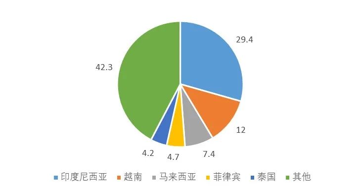 中国大蒜主要出口到东南亚国家。2021年出口前五大市场分别为印度尼西亚、越南、马来西亚、菲律宾和泰国。其中,印度尼西亚56.3万吨,占出口总量的29.4%;越南22.9万吨,占出口总量的12.0%;马来西亚14.1万吨,占出口总量的7.4%;菲律宾9.1万吨,占出口总量的4.7%;泰国8.1万吨,占出口总量的4.2%。