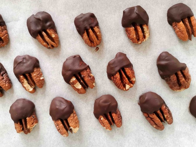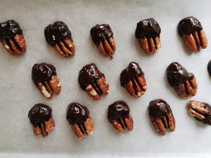 步骤6. 把蘸完酱的碧根果放在垫了油纸的盘子上,放到冰箱继续冷却10分钟,等巧克力凝固就可以吃啦!