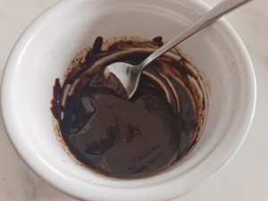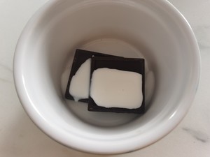 两块巧克力20g放入碗里,加一丢丢奶/奶油,目的是为了让巧克力等会更均匀融化开不会太粘稠,放入微波炉打20-30s。