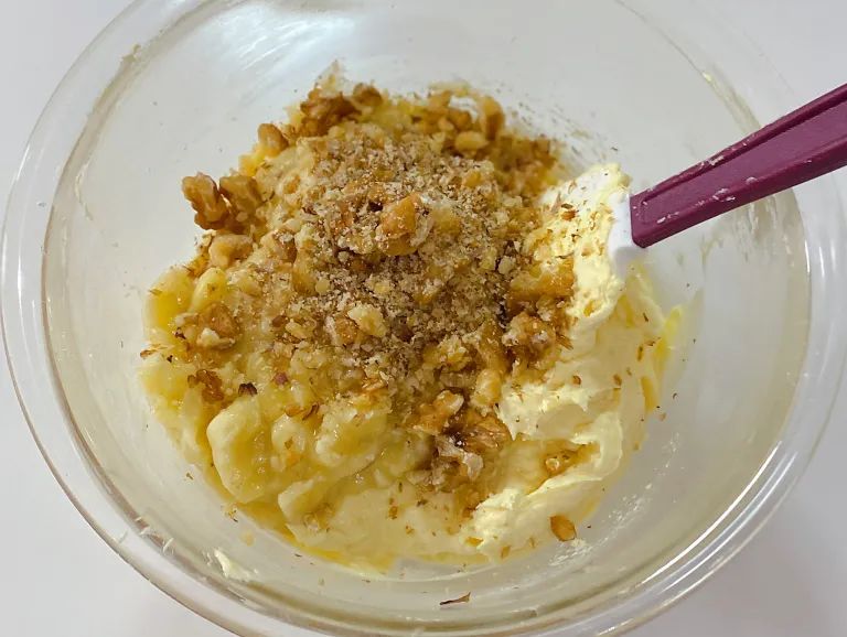 7.加入香蕉泥和30克核桃碎拌匀。