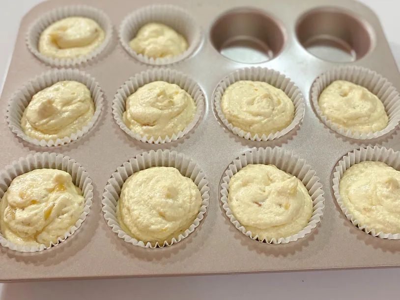 8.面糊装入裱花袋中,挤入纸托8分满。
