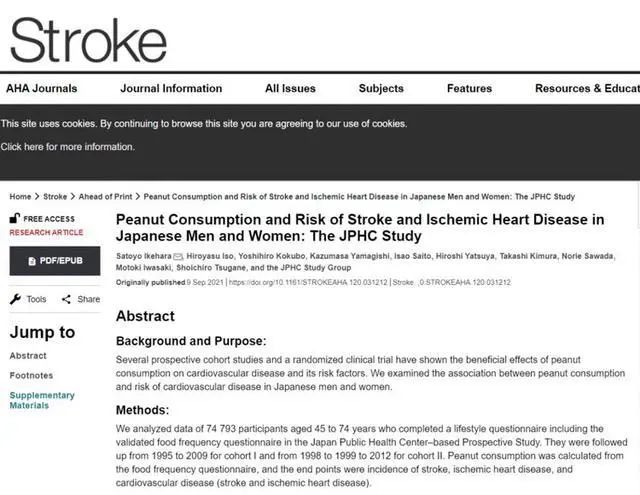 近期发表在《Stroke》(卒中)杂志上的一项来自于日本的研究,对于吃花生和心脑血管健康的关系做出了分析,该研究共有74793名参与者,年龄在45岁到74岁之间,研究者通过食物频率问卷计算出了参与者的花生摄入量,并进行了长达平均14.8年的长期随访。