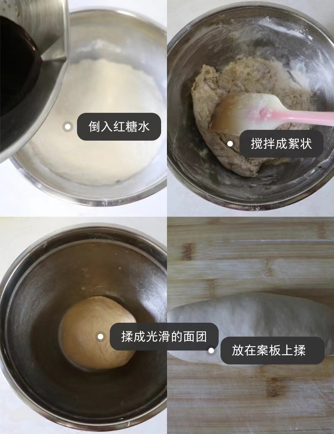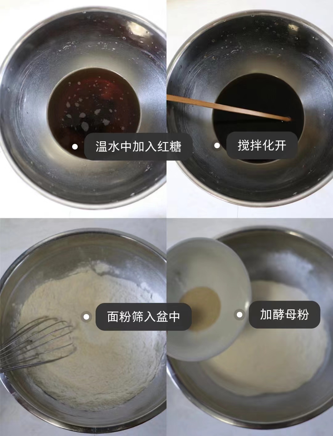 首先准备好所需的材料。红糖加入温水中用筷子搅匀融化一旁备用,盆中加入中筋面粉,加酵母粉,倒入红糖水拌匀,揉成光滑的面团。